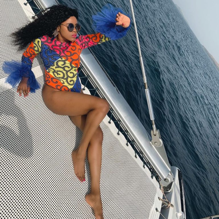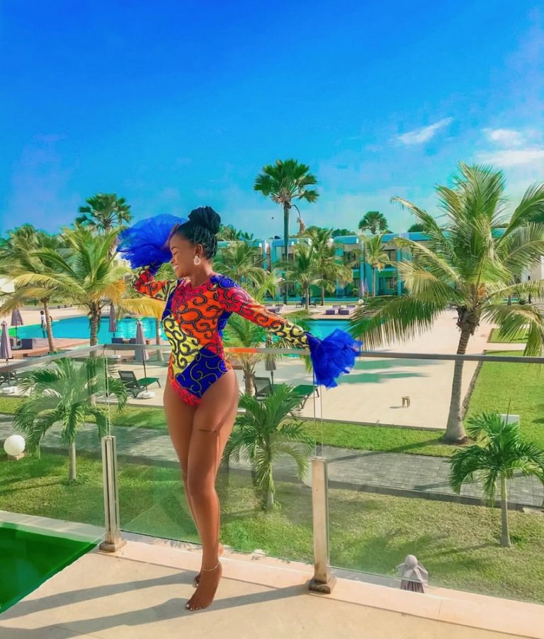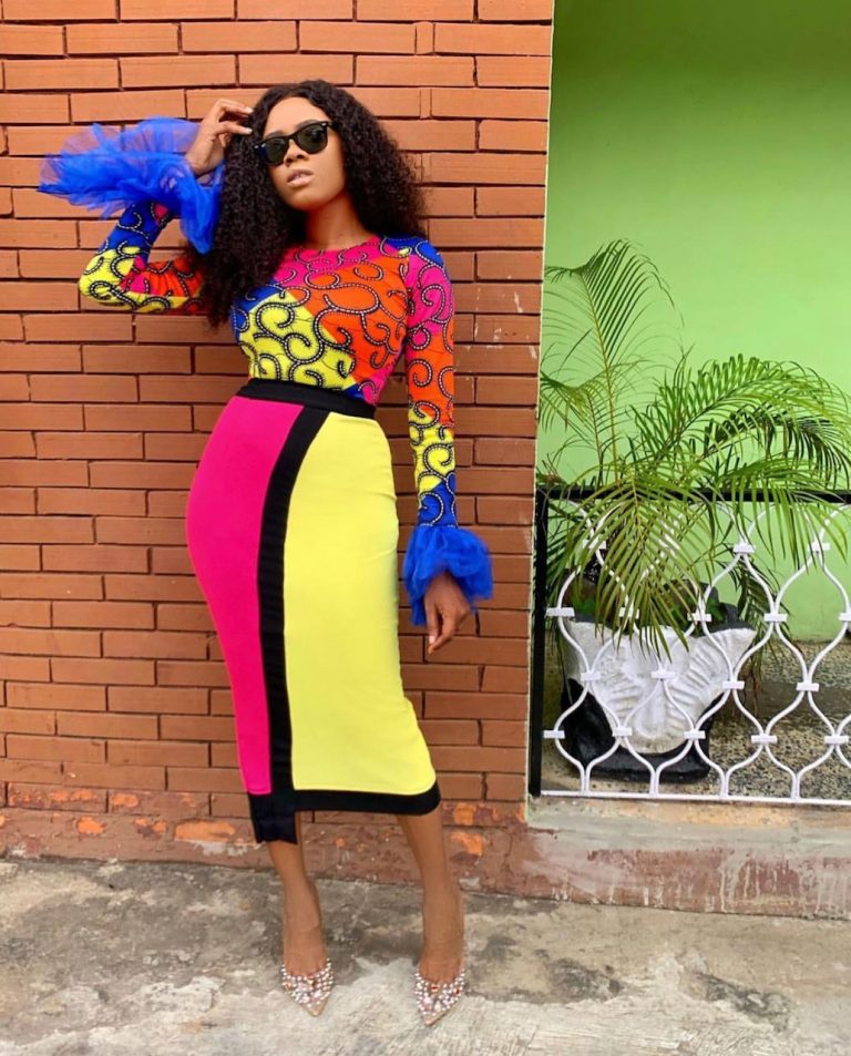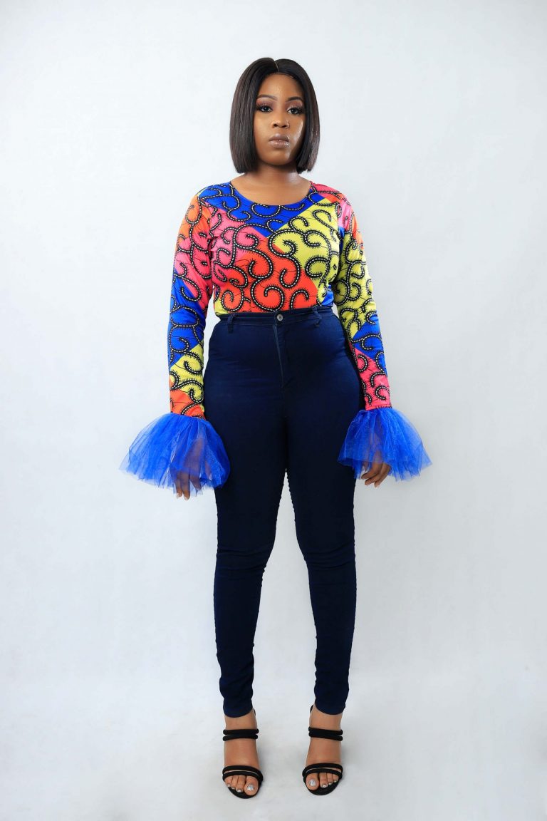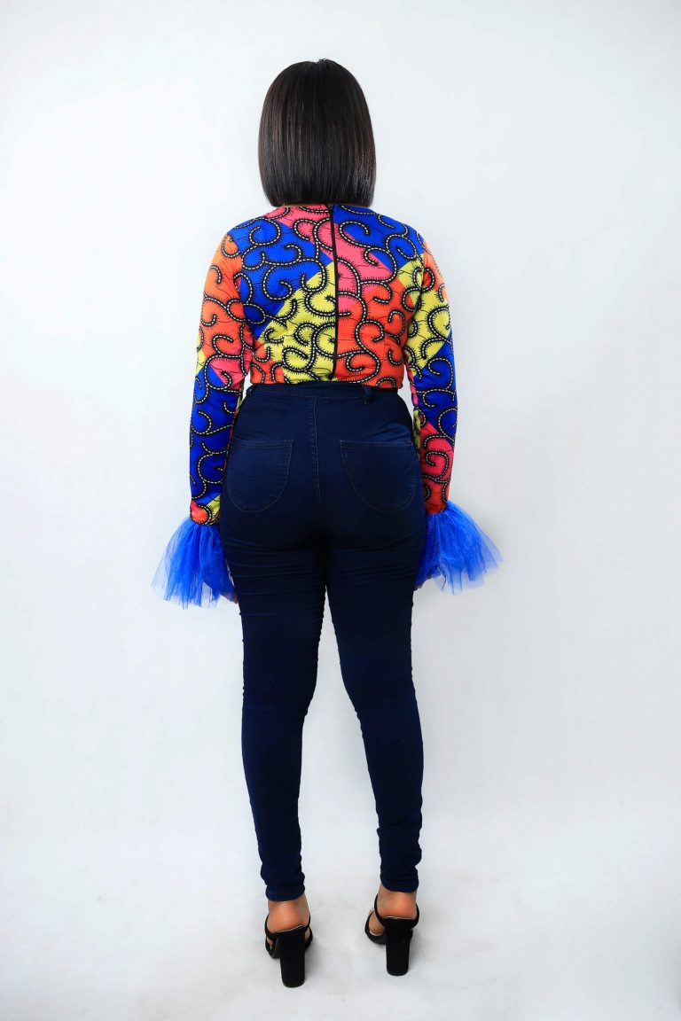 Colourful Bodysuit made with Ankara stretchy fabric and tulle on the wrists.