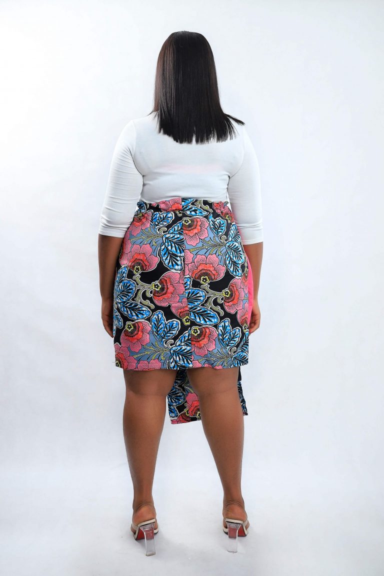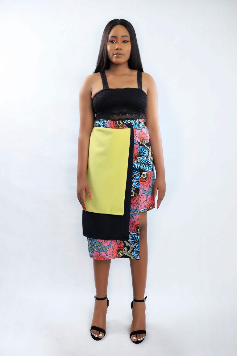 A slightly A-line Skirt with overlay. Made with crepe and Ankara cotton fabric.