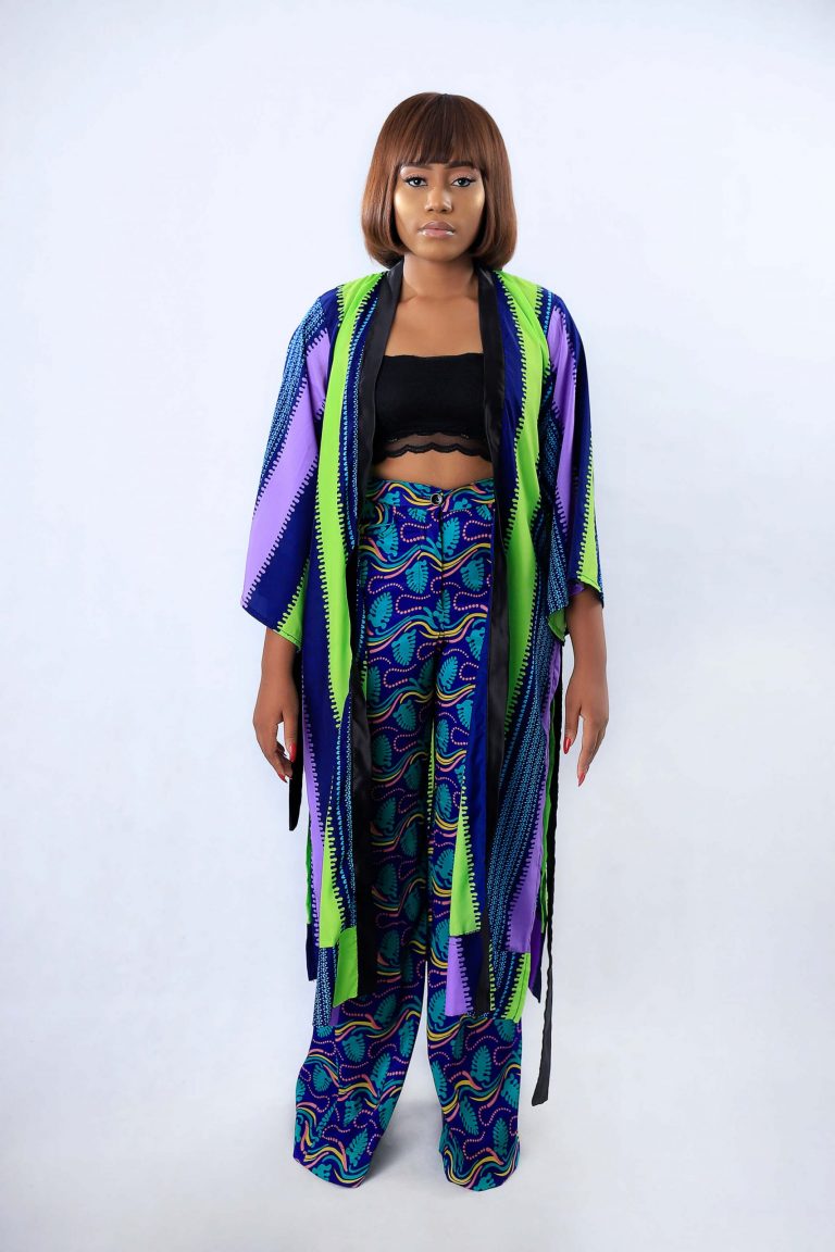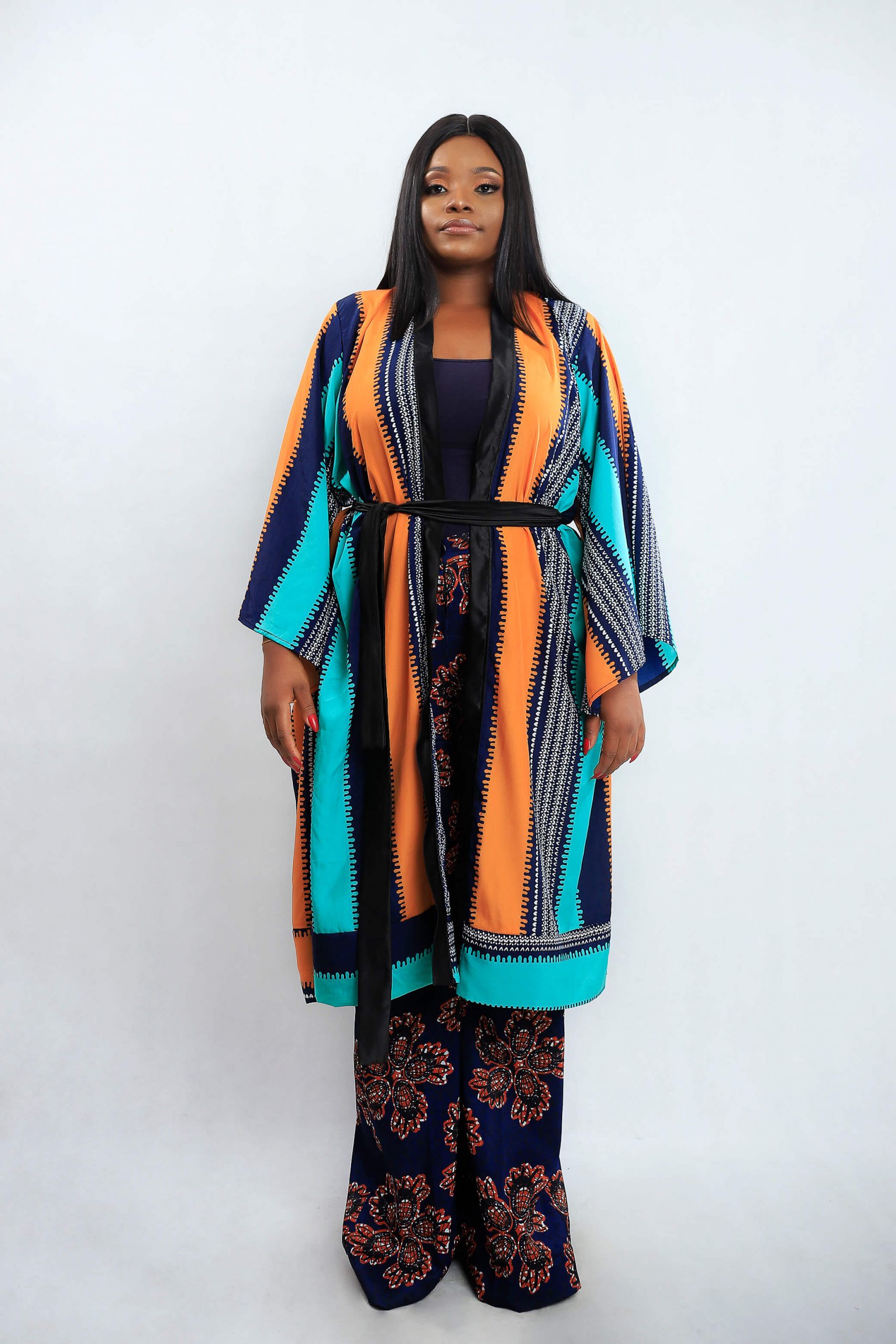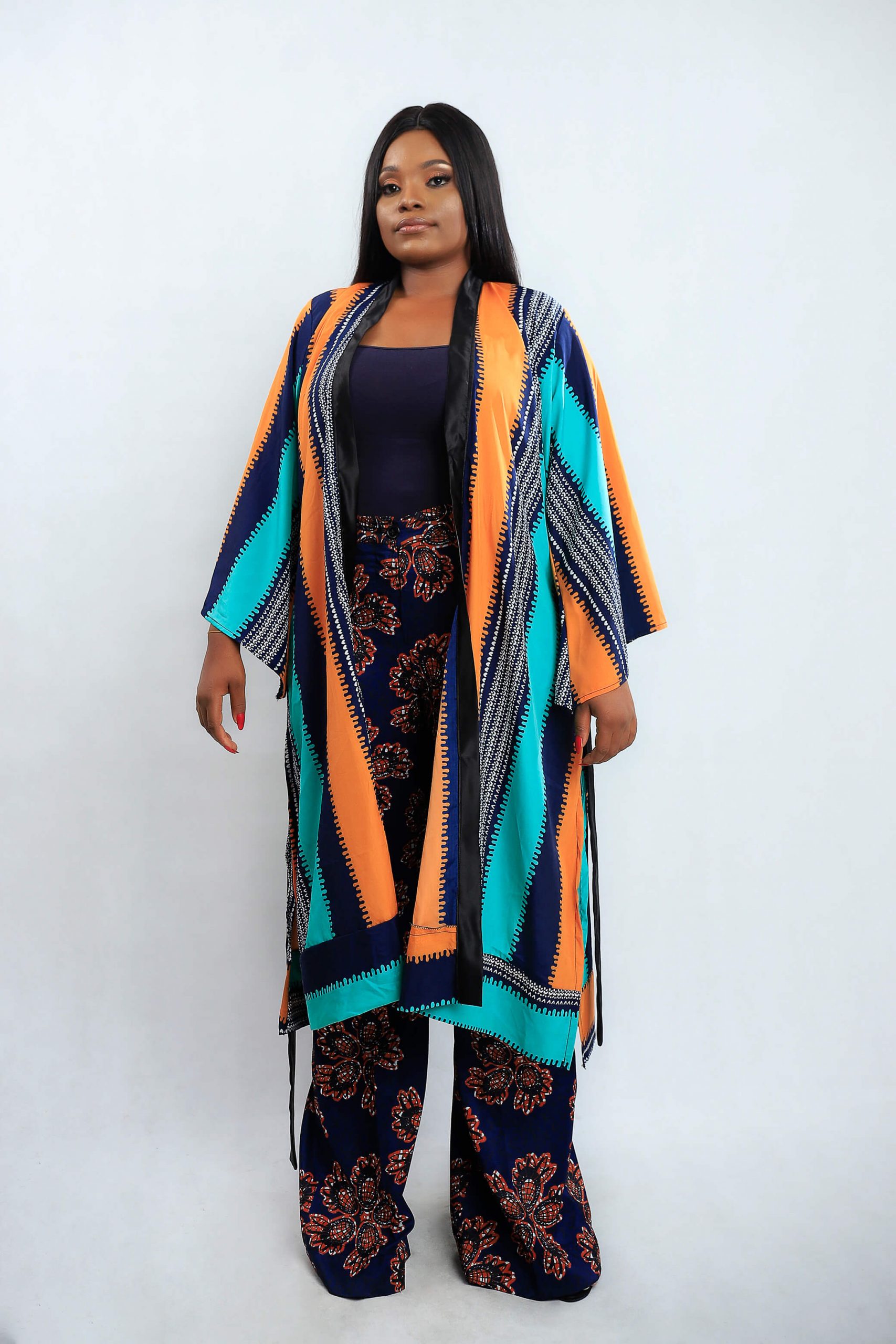 Made with mixed Ankara Silk Prints with satin tapings and detachable belt.