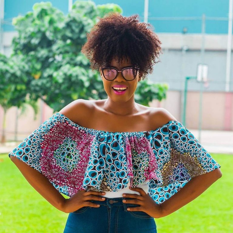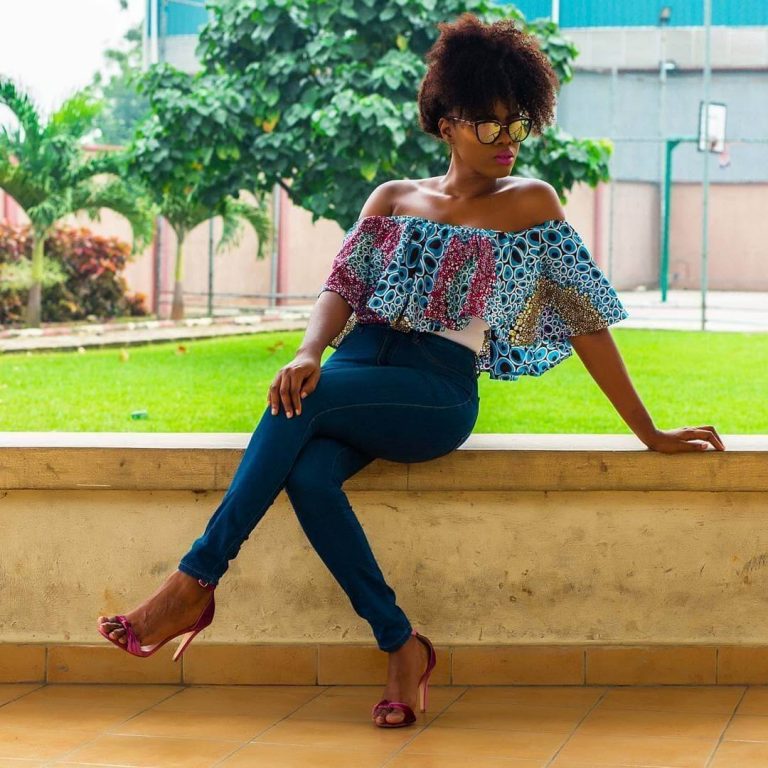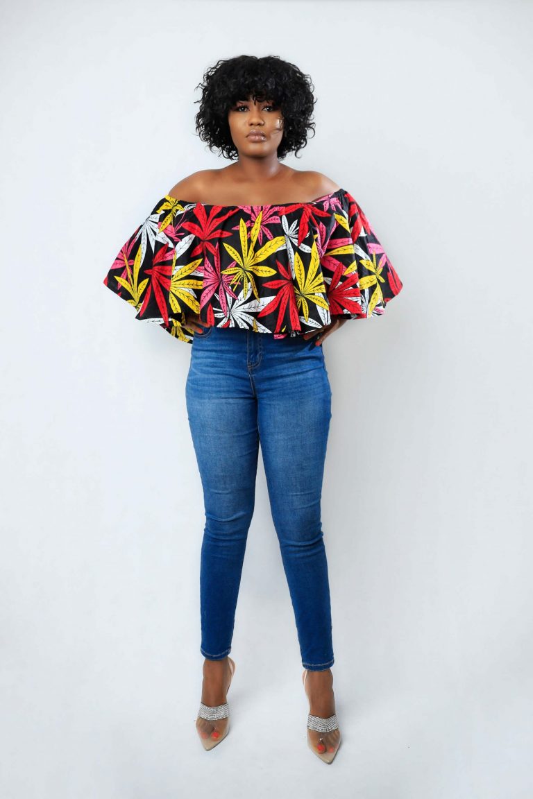 An off-shoulder Ankara flare bodysuit mixed with plain stretchy material.