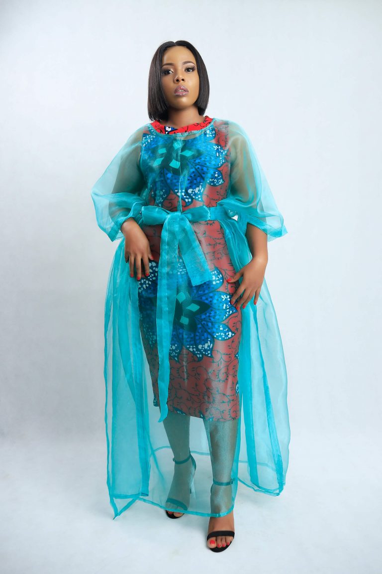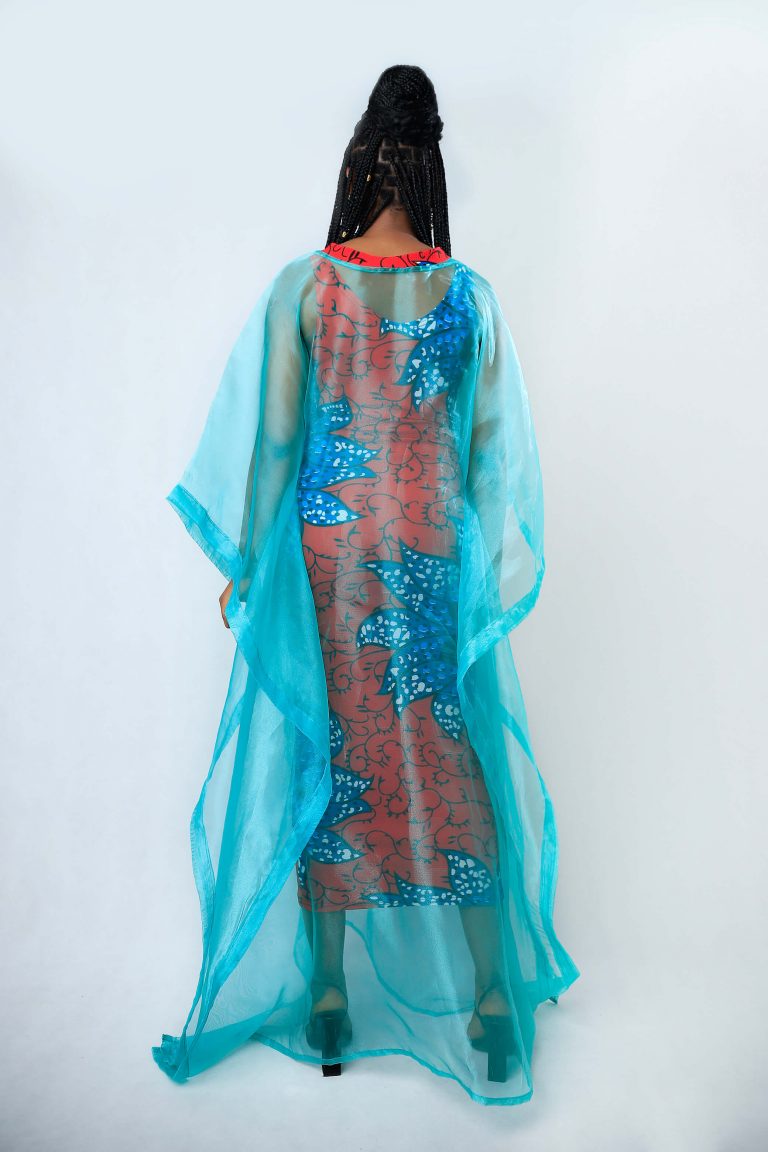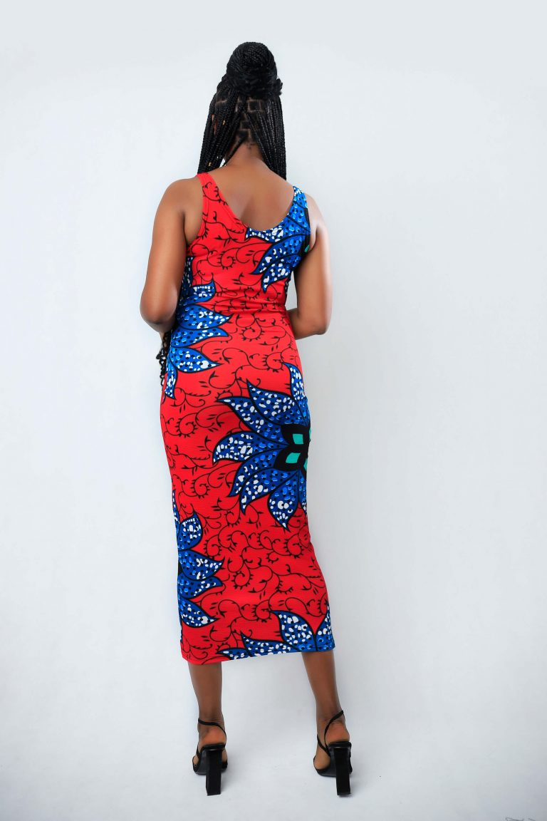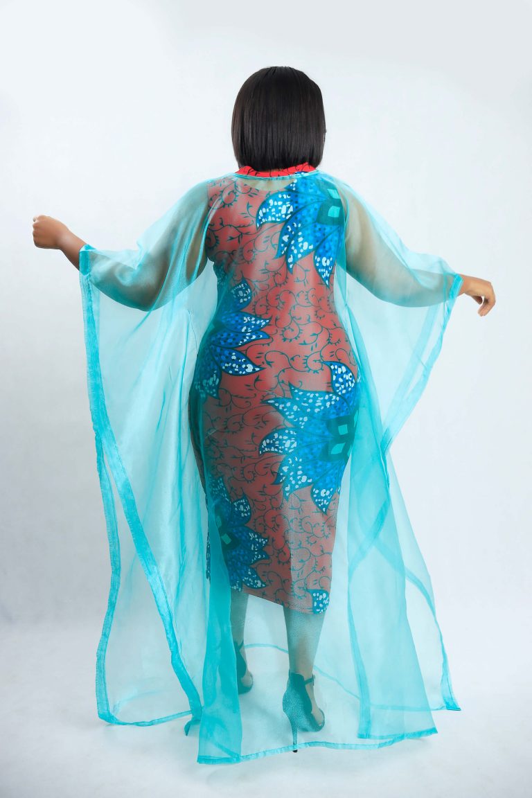 A bodycon midi dress made with Ankara stretchy fabric paired with a long organza top.