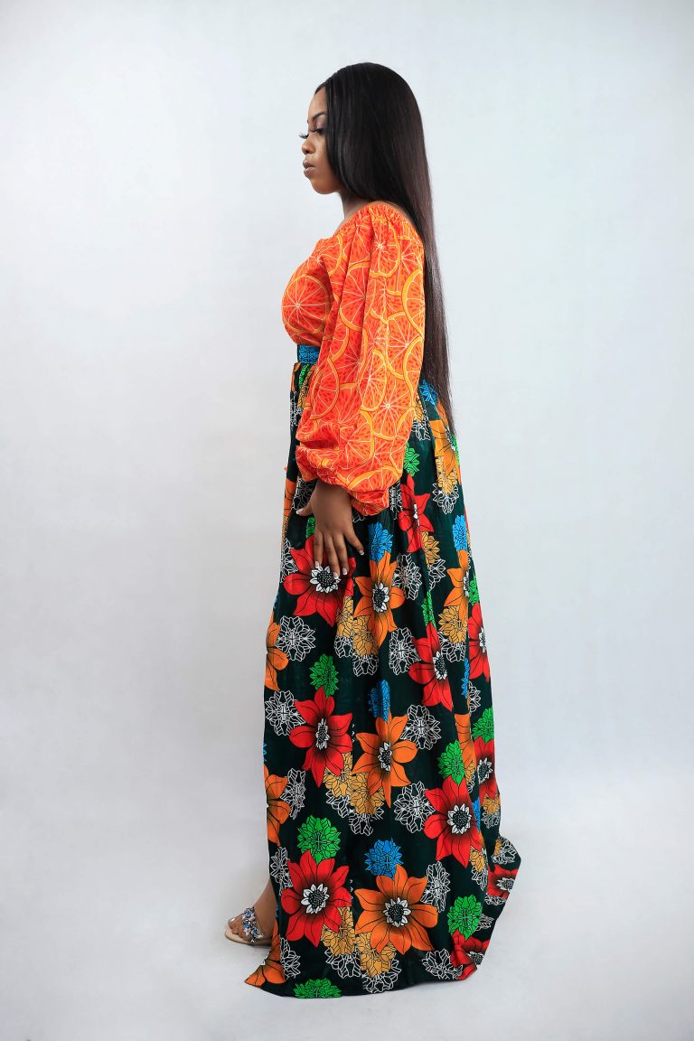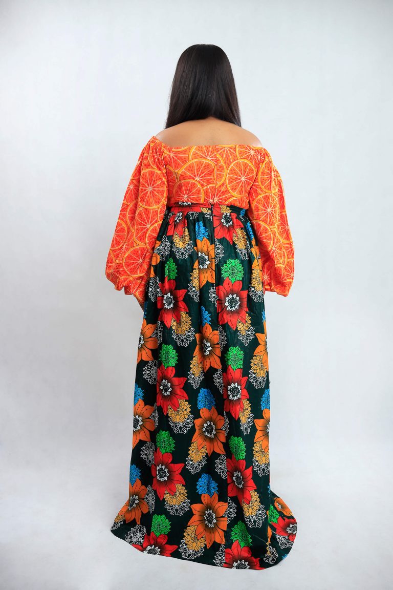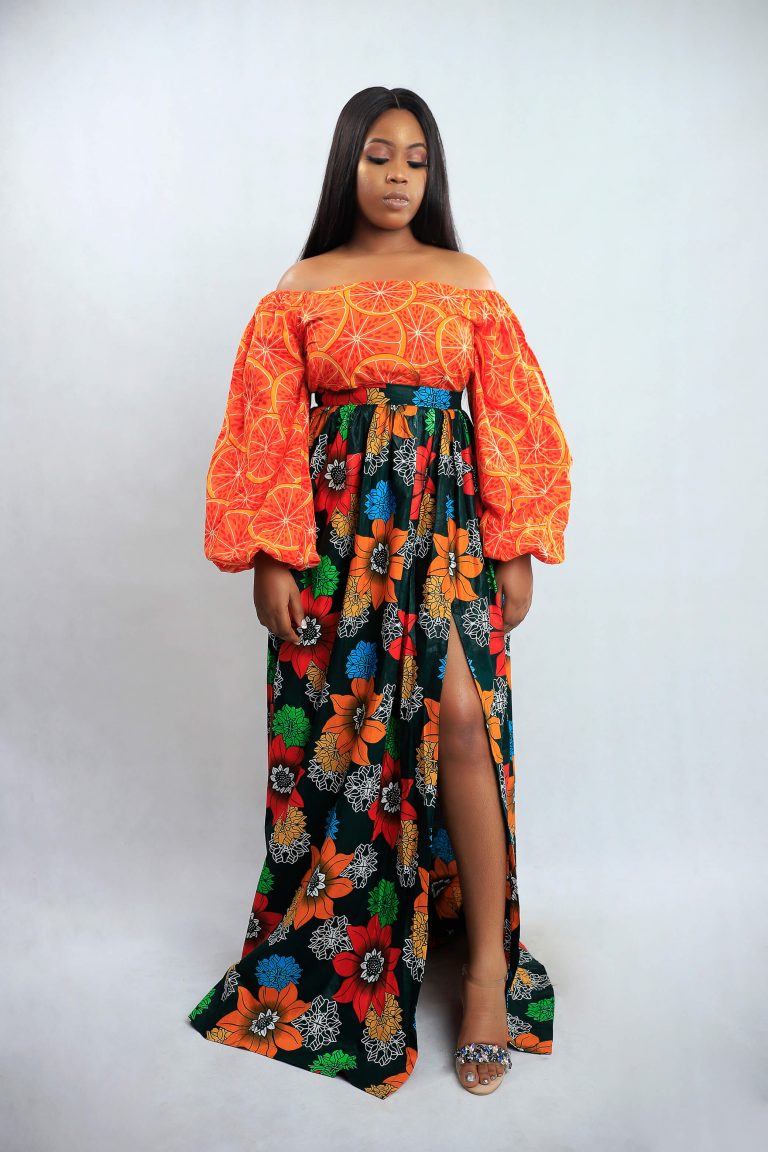 The mixed prints set is made from Ankara cotton fabrics. Off-shoulder top and maxi skirt with front slit.