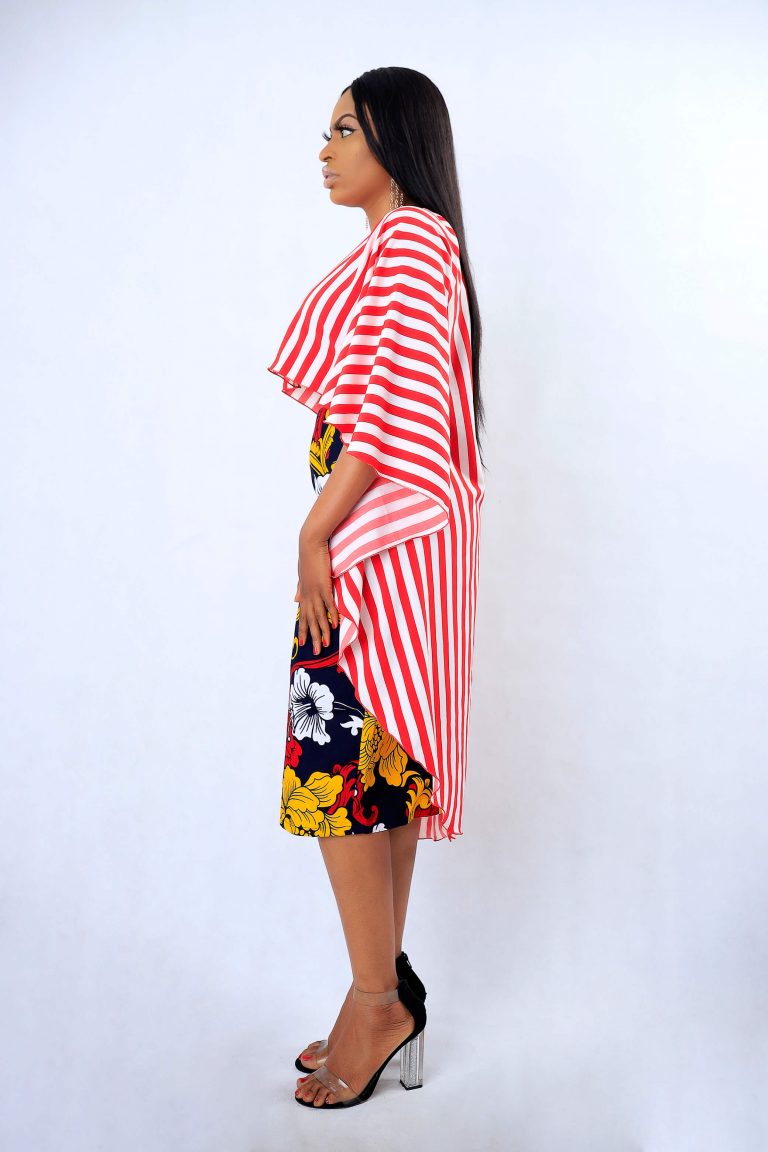 A high-low chiffon top paired with an Ankara pencil midi skirt.